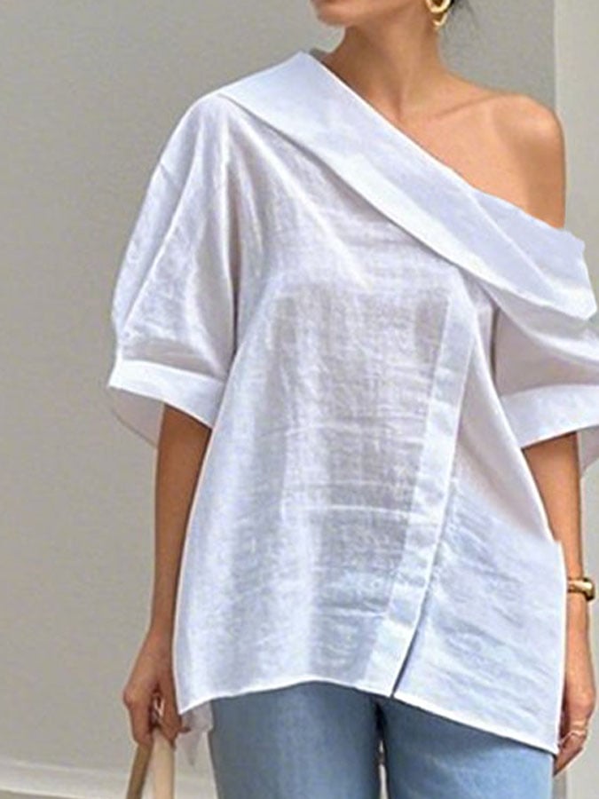 Women's Casual Solid Color One Shoulder Mid Sleeve Cotton and Linen Top