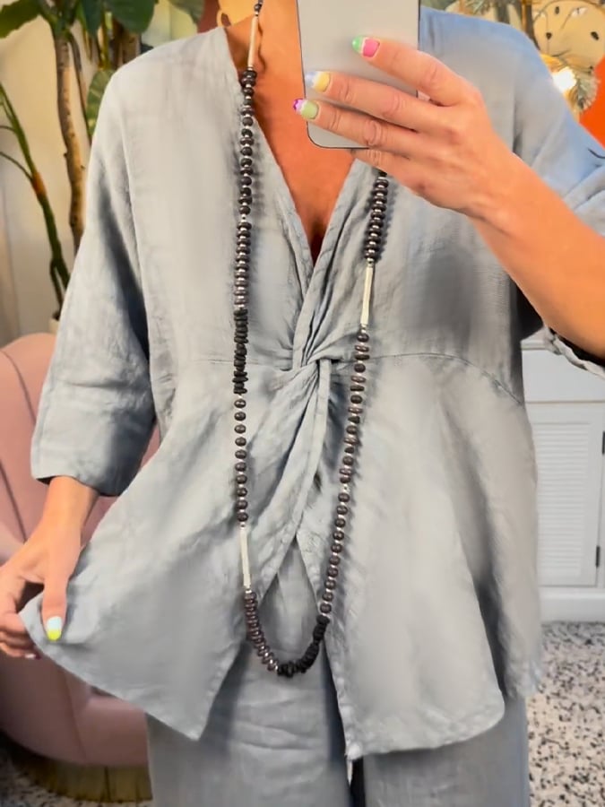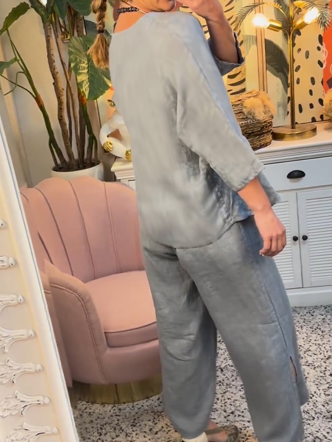 Women'S Casual V-Neck Twisted Cotton And Linen Two-Piece Suit