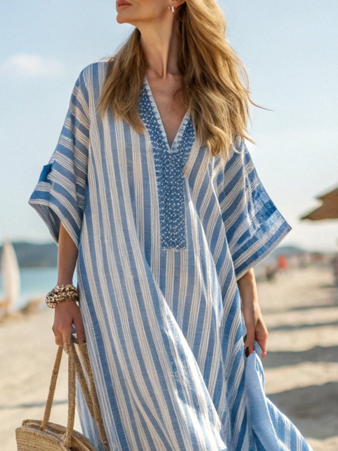 Women'S Loose Striped Holiday Cotton And Linen Dress